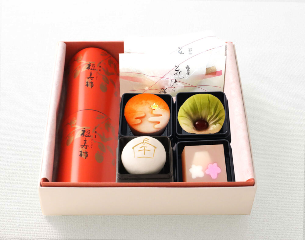 【福寿柿】2個、【花びら餅】2個、【上生(松、曙、干支)】、【富士山羊羹】 1個
